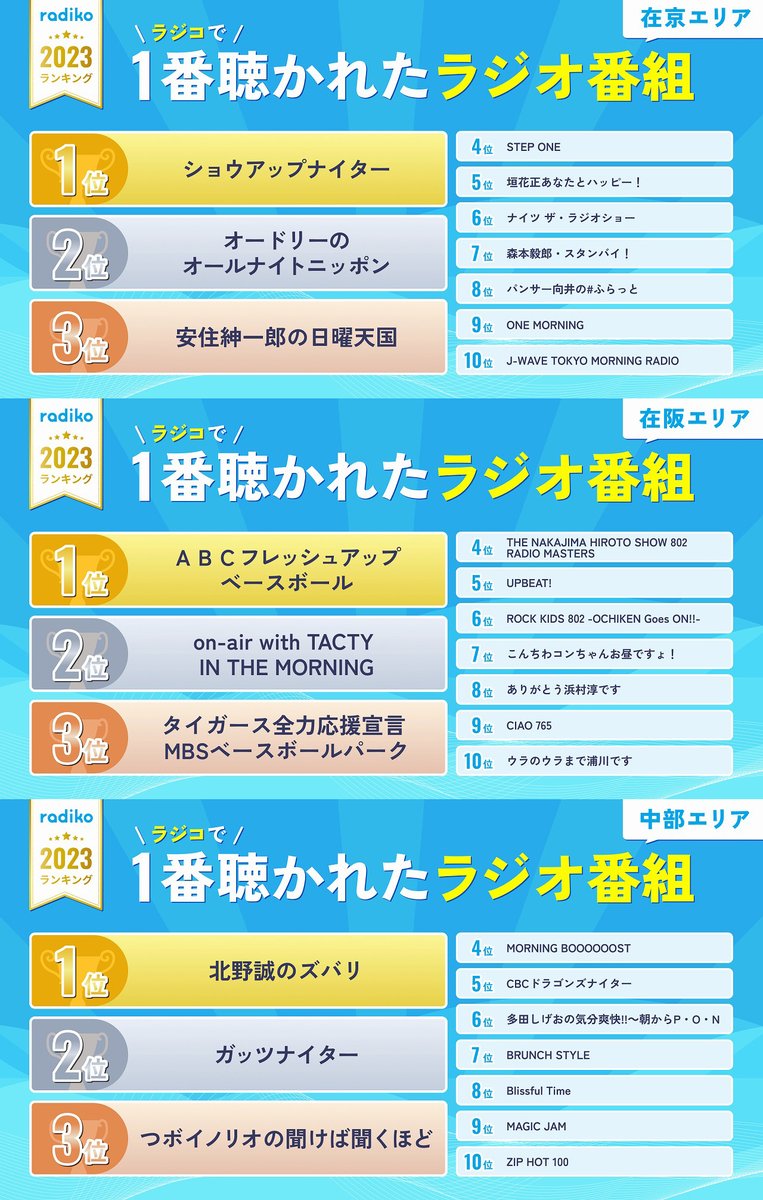 2023年ラジコで聴かれた在京在阪中部エリアのラジオ番組TOP10