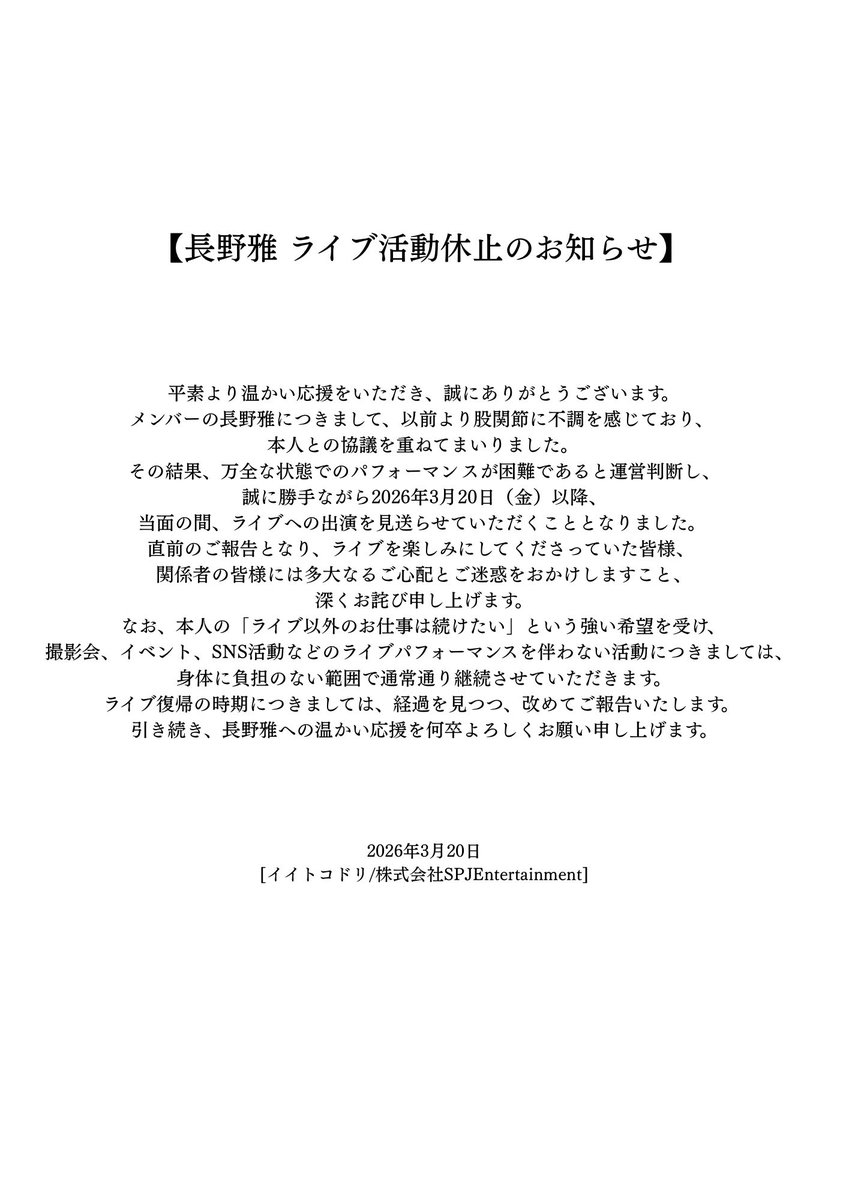 いつも温かいご声援をいただき誠にありがとうございます。長野雅に関して、大切なお知らせがございます。