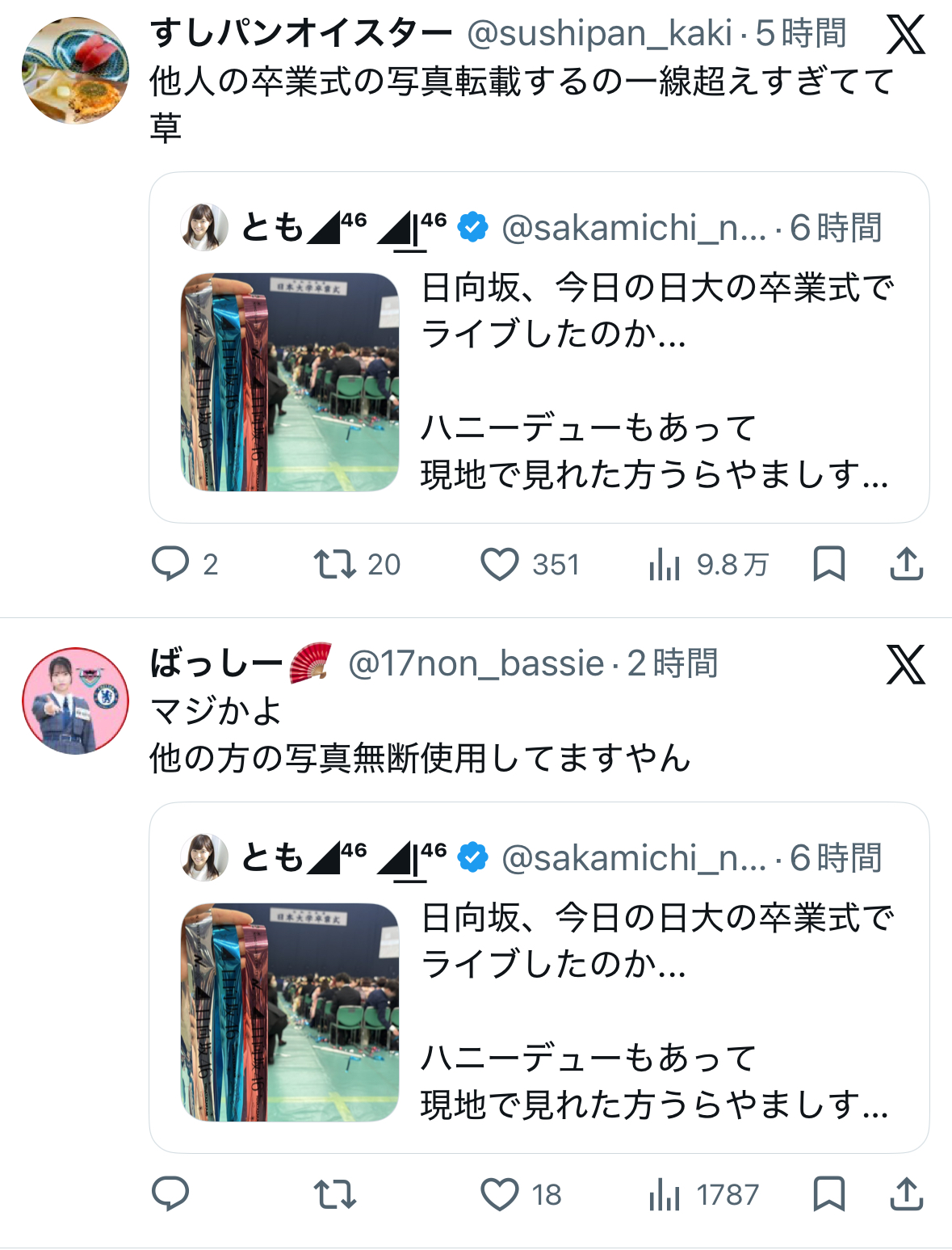 【大爆笑】ライブではなく関係者席を見ることで有名な五百城、正源司オタのおじさん、他人の卒業写真を無断使用し、複垢もバレるwwwww