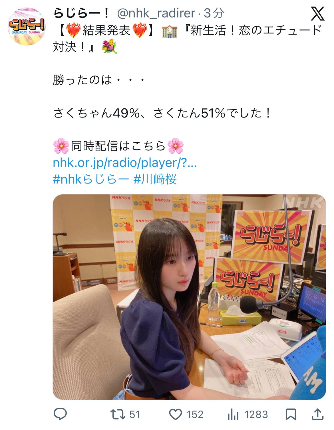 川﨑桜ちゃん、らじらー対決企画でまた遠藤さくらに勝利!☺️
