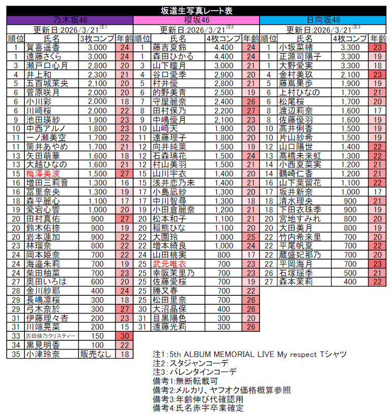 最新の坂道グループ生写真レートランキング!