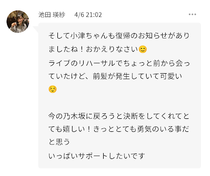 【悲報】センター池田さん、小津ちゃん復帰に今の乃木坂は厳しいと苦言を呈する