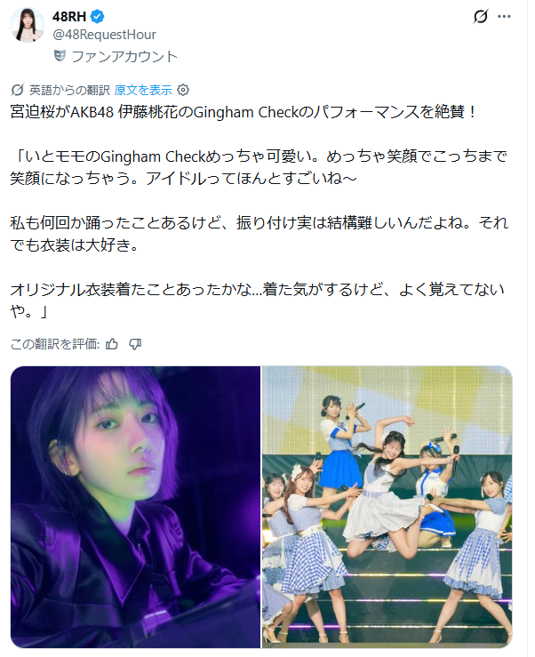 【朗報】AKB伊藤百花、あの宮脇咲良さんから称賛される【ギンガムチェック】