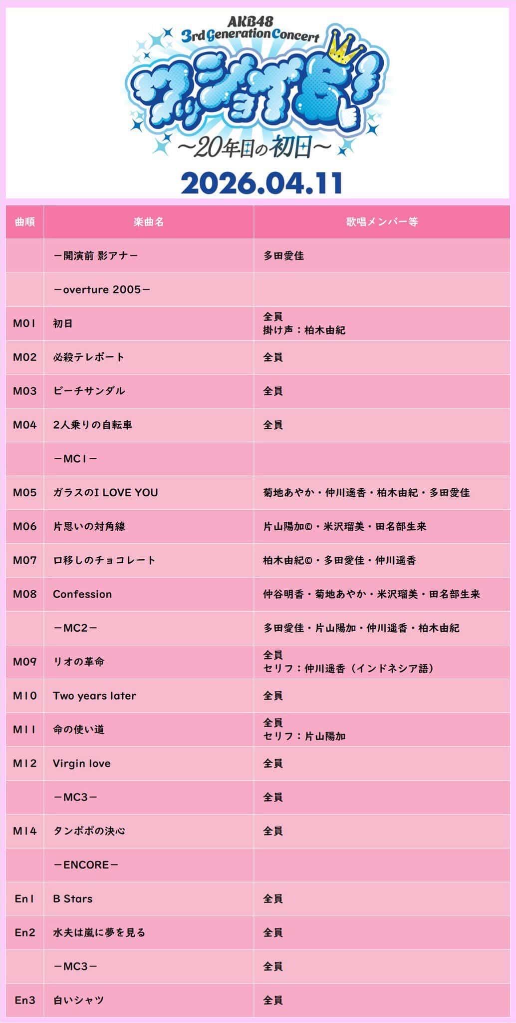 昨日開催されたAKB48 3期生コンサートのセットリストをご覧ください