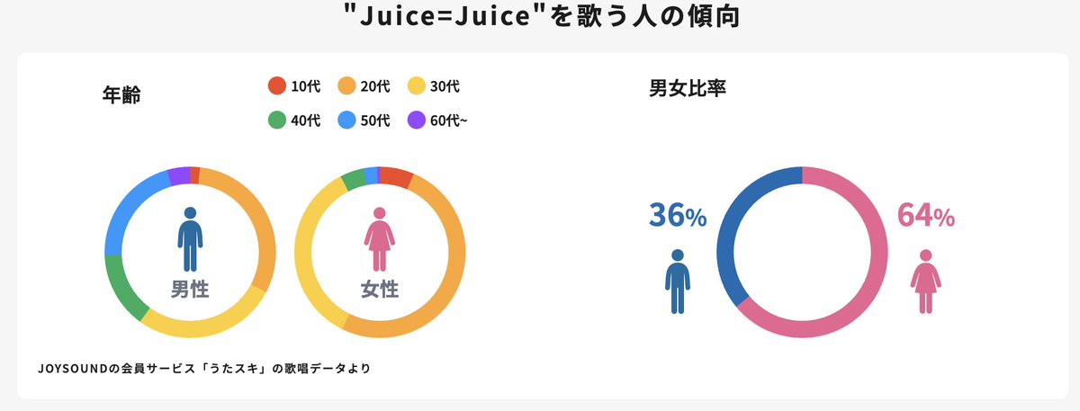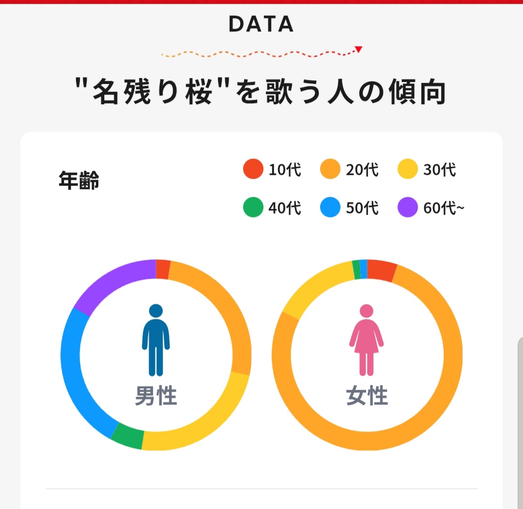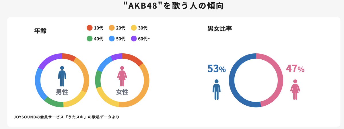 JOY SOUND 歌詞サイトでアーティストをよく歌う年齢・男女比の分析見れるんですけど、AKB48さんのファンは男性がちょい多めですね…🌸