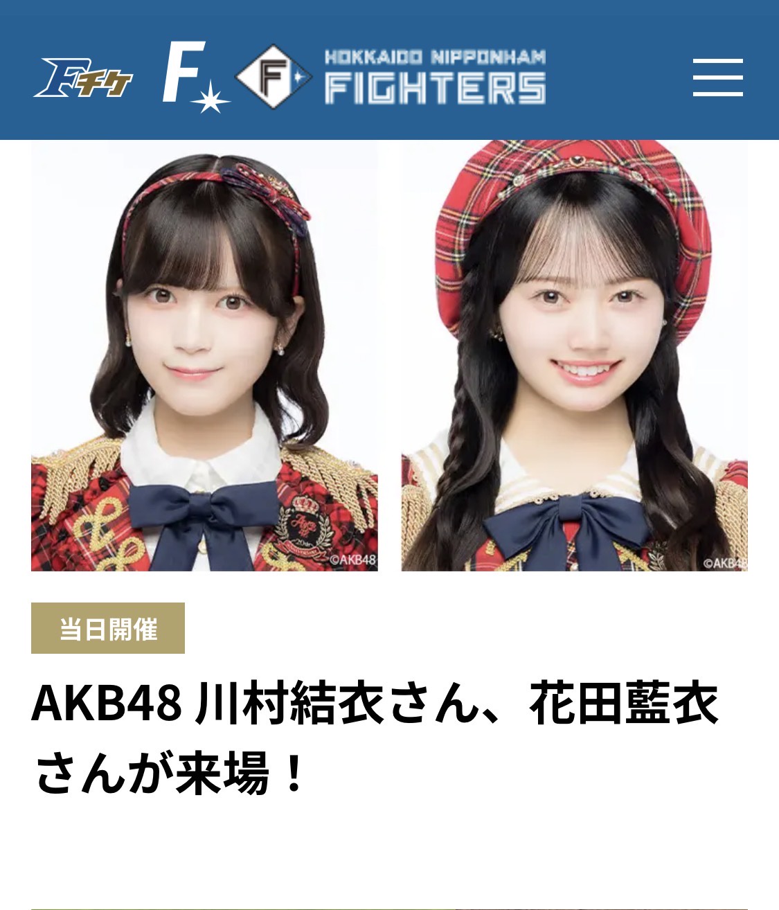 川村は幼少期から球場に通って応援していたほどの家族揃ってのファイ ターズファン。「AKB48 メンバーとしていつか球場に応援にいきたい」と加入当日から密かに抱いていた夢が実現 しました。しかも、試合前のファーストピッチという大役を任され、「ファイターズ勝利のために全力でエスコンフ ィールドを盛り上げます!」と意気込んでいます。