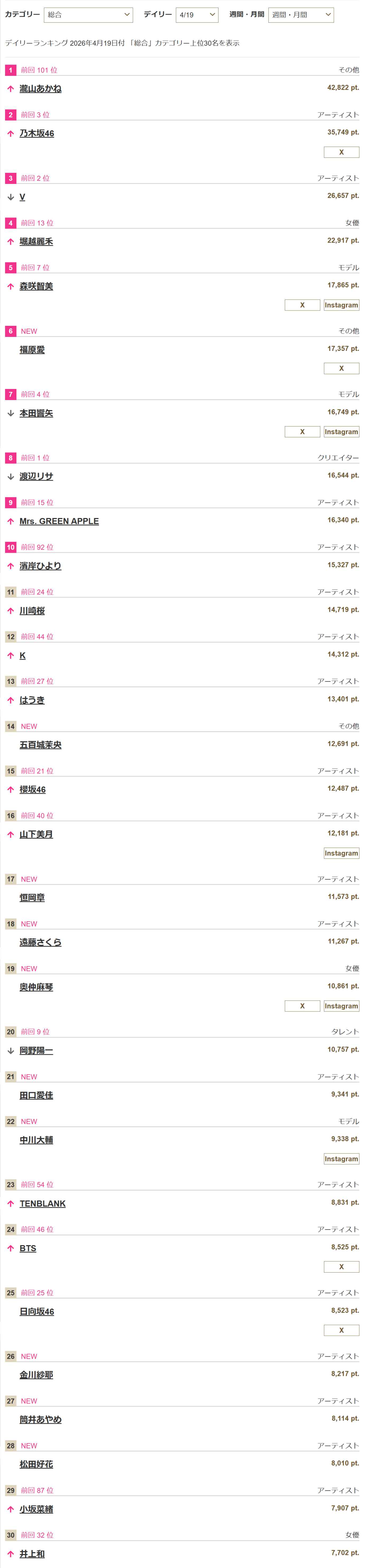 アーティスト、モデルランキング内